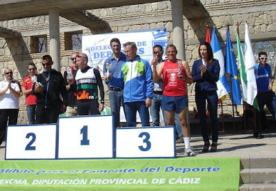 Y ASI LLEGAMOS A LA COQUETA, PERO FAMILIAR ENTREGA DE PREMIOS, EN LA QUE POR SEGUNDA VEZ EN LA HISTORIA, UN MIEMBRO DEL NUEVA JARILLA CLUB DE ATLETISMO, POR SEGUNDA VEZ, JUAN RUIZ, SE SUBE EN EL CAJON PARA RECOGER EL PREMIO AL CORREDOR CON MAYOR EDAD EN TERMINAR EN LA PRUEBA, A MANOS DE SU CONCEJAL DE DEPORTES, Y ES QUE, CON ESCASOS CASI DOS MESES PARA TENER 70 AÑOS, JUAN RUIZ DISFRUTA SEMANA TRAS SEMANA DE LAS PRUEBAS QUE REALIZAMOS EN LA GEOGRAFIA GADITANA Y DEMUESTRA QUE VIVIR EN NUEVA JARILLA ALARGA LA SALUD Y LA FORMA FISICA.